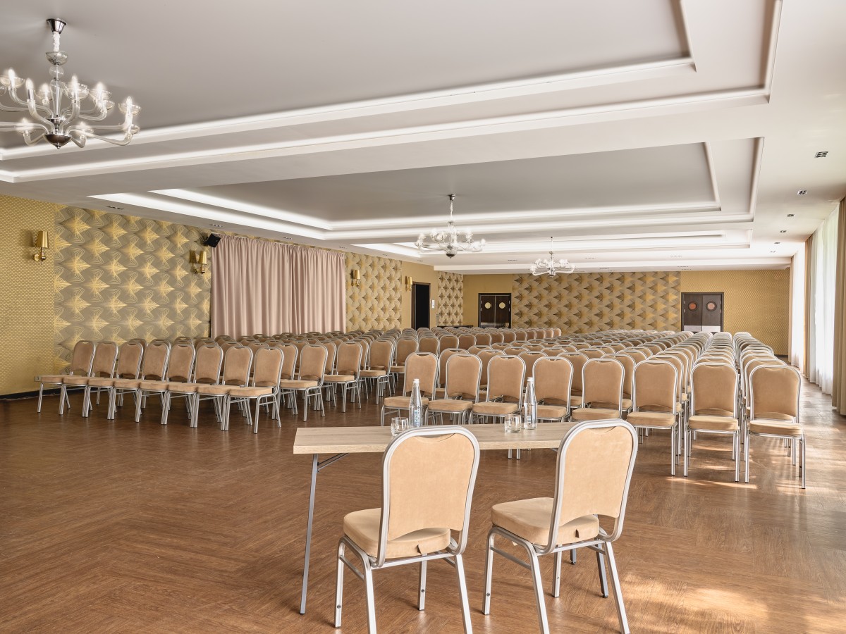 Зал прекрасно подходит для проведения различных мероприятий. В интерьере зала использованы светлые бежевые тона, хрустальные люстры, многоуровневая подсветка и оригинальная лепнина. Возможны различные виды расстановки в зале, в зависимости от вида мероприятия, а также оснащение зала профессиональной световой и звуковой аппаратуры.
