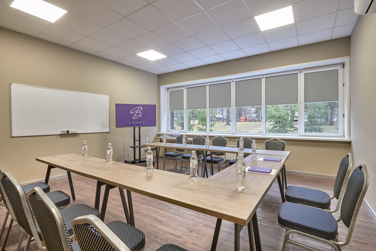 В зале светло и уютно, благодаря большому окну, занимающему одну из стен помещения. Из него открывается вид на зеленый ландшафт. Если вы хотите провести видео-презентацию, окно можно закрыть жалюзи.